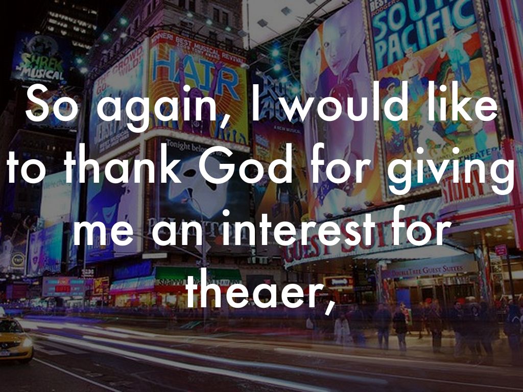 So I would like to thank God for blessing me with an interest in theater and journalism, because I could have a likeness for so many other things that are againt God like smoking, drinking, partying, doing drugs, gambling, and so many other dangerous things, but God has blessed me by having mercy on me, and giving me an interest for something that is not really a sin. It's just what you do and what you watch that makes it a sin...