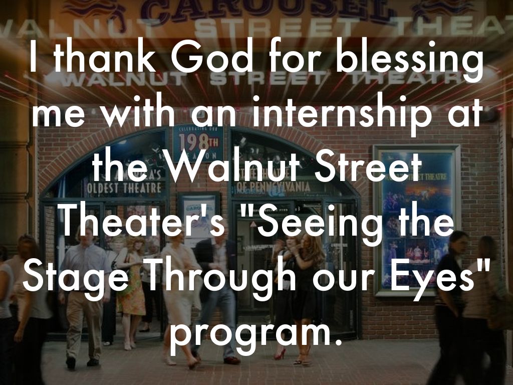 I thank God for blessing me with an internship at the Walnut Street Theater's "Seeing the Stage Through our Eyes" program.