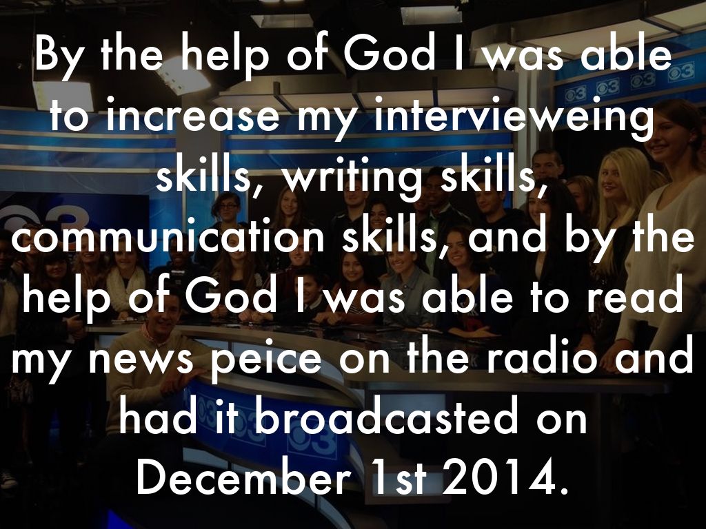 By the help of God I was able to increase my intervieweing skills, writing skills, communication skills, and by the help of God I was able to read my news peice on the radio and had it broadcasted on December 1st 2014.