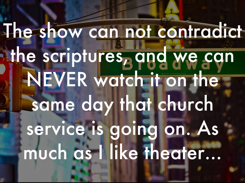 The show can not contradict the scriptures, and we can NEVER watch it on the same day that church service is going on. As much as I like theater...