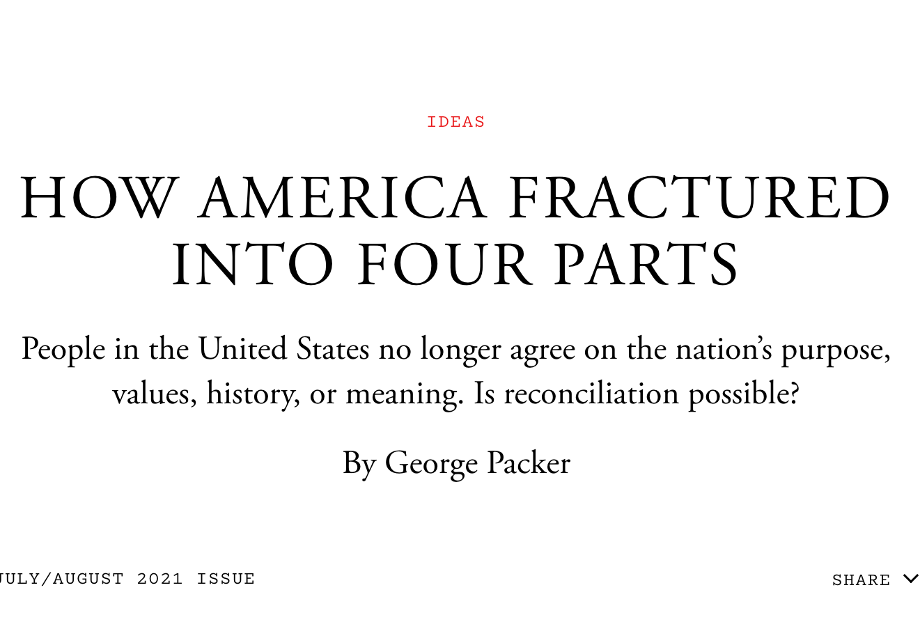 Call this narrative “Just America.” It’s another rebellion from below. As Real America breaks down the ossified libertarianism of Free America, Just America assails the complacent meritocracy of Smart America. It does the hard, essential thing that the other three narratives avoid, that white Americans have avoided throughout history. It forces us to see the straight line that runs from slavery and segregation to the second-class life so many Black Americans live today—the betrayal of equality that has always been the country’s great moral shame, the heart of its social problems.