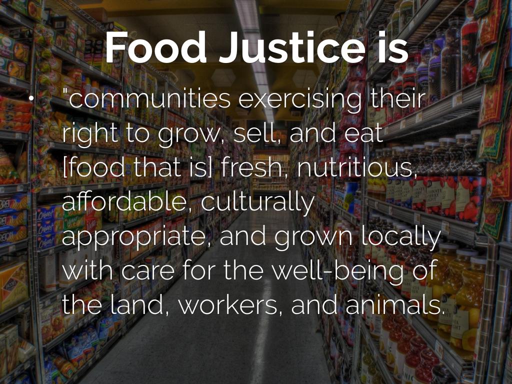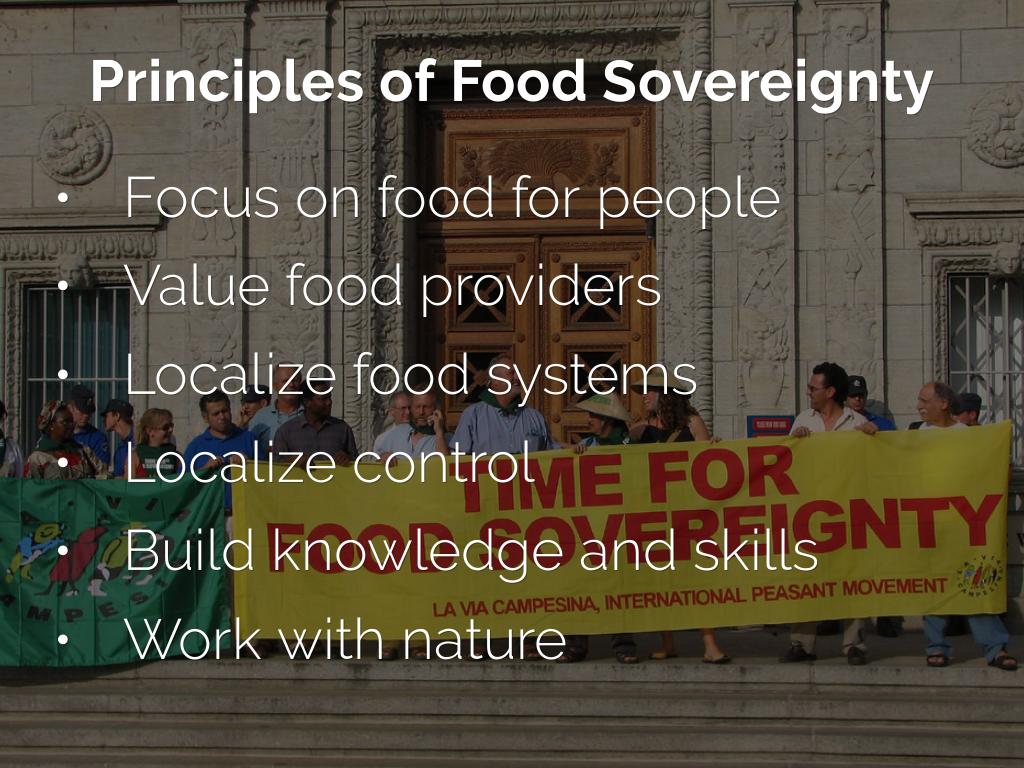 "communities exercising their right to grow, sell, and eat [food that is] fresh, nutritious, affordable, culturally appropriate, and grown locally with care for the well-being of the land, workers, and animals".