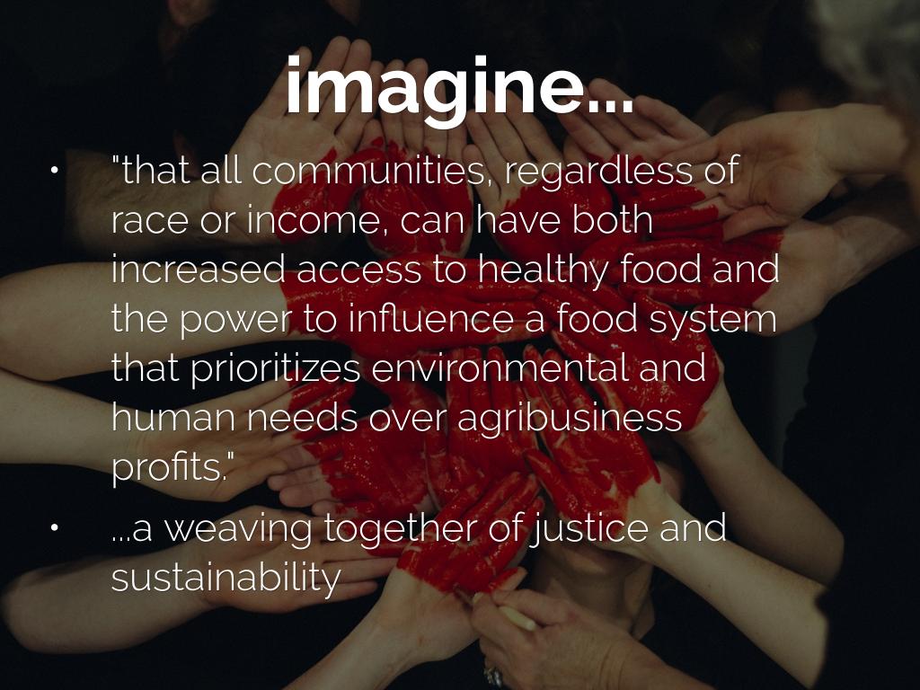 "that all communities, regardless of race or income, can have both increased access to healthy food and the power to influence a food system that prioritizes environmental and human needs over agribusiness profits."