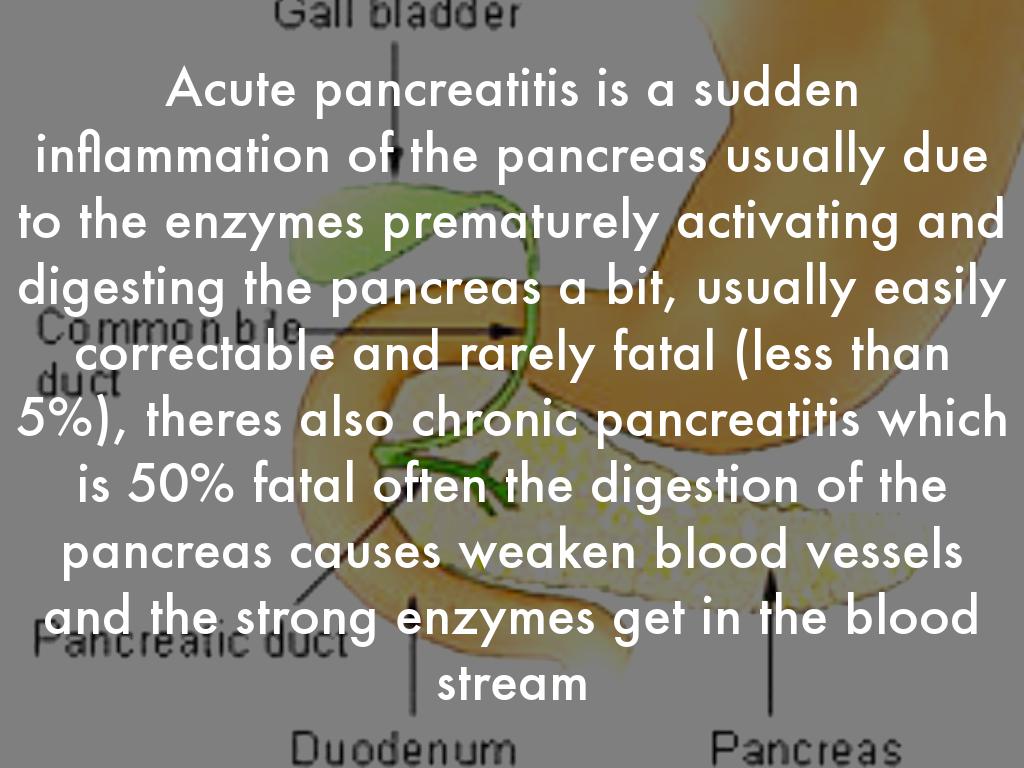 Acute pancreatitis is a sudden inflammation of the pancreas usually due to the enzymes prematurely activating and digesting the pancreas a bit, usually easily correctable and rarely fatal (less than 5%), theres also chronic pancreatitis which is 50% fatal often the digestion of the pancreas causes weaken blood vessels and the strong enzymes get in the blood stream