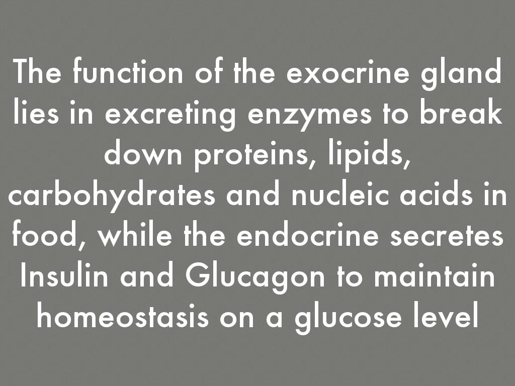 The function of the exocrine gland lies in excreting enzymes to break down proteins, lipids, carbohydrates and nucleic acids in food, while the endocrine secretes Insulin and Glucagon to maintain homeostasis on a glucose level