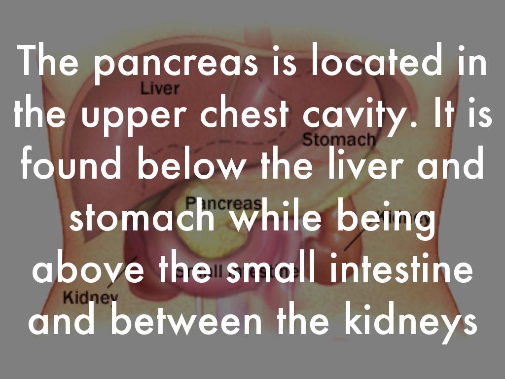 The pancreas is located in the upper chest cavity. It is found below the liver and stomach while being above the small intestine and between the kidneys