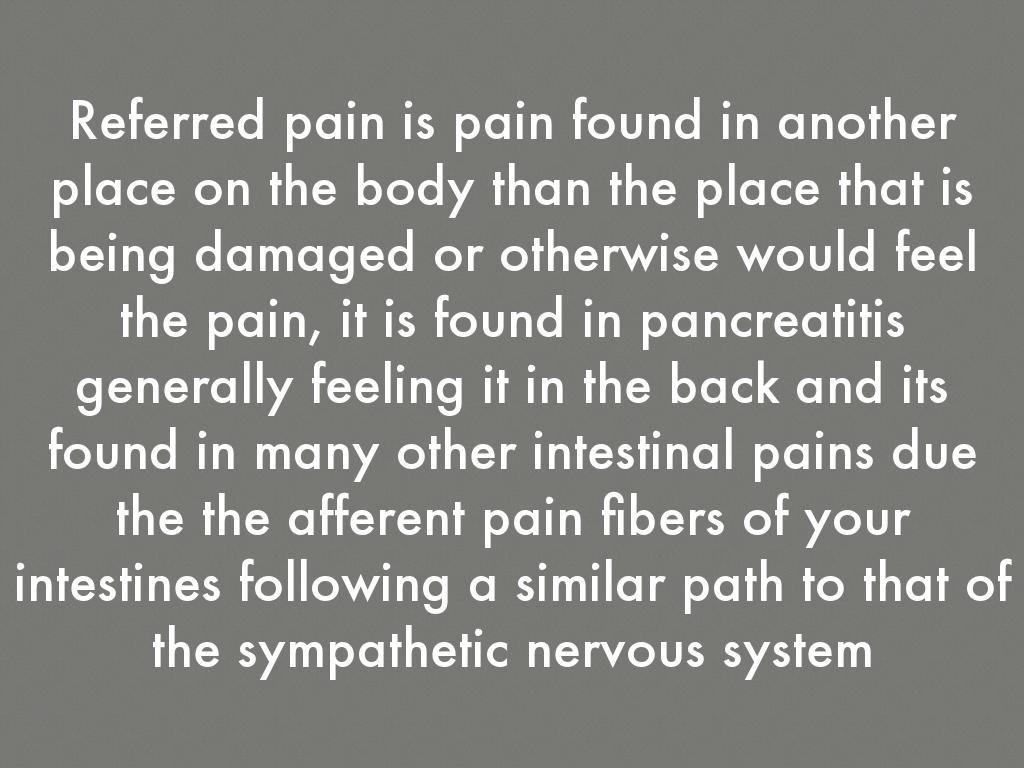 Referred pain is pain found in another place on the body than the place that is being damaged or otherwise would feel the pain, it is found in pancreatitis generally feeling it in the back and its found in many other intestinal pains due the the afferent pain fibers of your intestines following a similar path to that of the sympathetic nervous system
