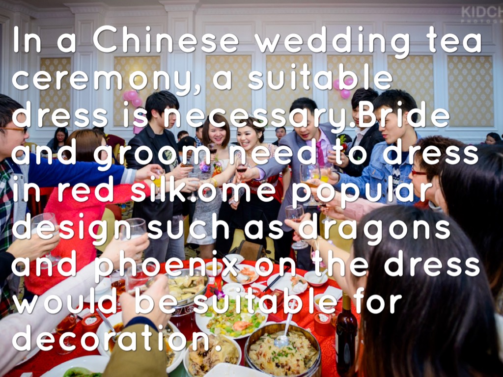In a Chinese wedding tea ceremony, a suitable dress is necessary.Bride and groom need to dress in red silk.ome popular design such as dragons and phoenix on the dress would be suitable for decoration.