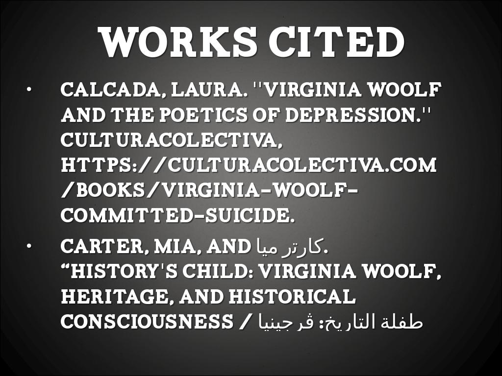 Carter, Mia, and ﻛﺎﺭﺗﺭ ﻣﻴﺎ. “History's Child: Virginia Woolf, Heritage, and Historical Consciousness / ﻃﻔﻠﺔ ﺍﻟﺘﺎﺭﻳﺦ: ﭬﺮﺟﻴﻨﻴﺎ ﻭﻭﻟﻒ ﻭﺍﻟﻤﻮﺭﻭﺙ ﻭﺍﻟﻮﻋﻲ ﺍﻟﺘﺎﺭﻳﺨﻲ.” Alif: Journal of Comparative Poetics, no. 27, 2007, pp. 68–95. JSTOR, JSTOR, www.jstor.org/stable/30197973