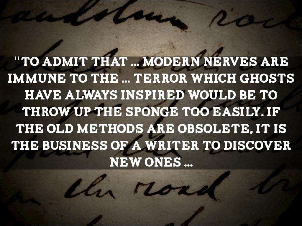 ''to admit that ... modern nerves are immune to the ... terror which ghosts have always inspired would be to throw up the sponge too easily. If the old methods are obsolete, it is the business of a writer to discover new ones ...