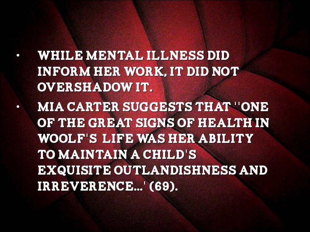 Mia Carter suggests that ''one of the great signs of health in Woolf's life was her ability to maintain a child's exquisite outlandishness and irreverence...' (69).