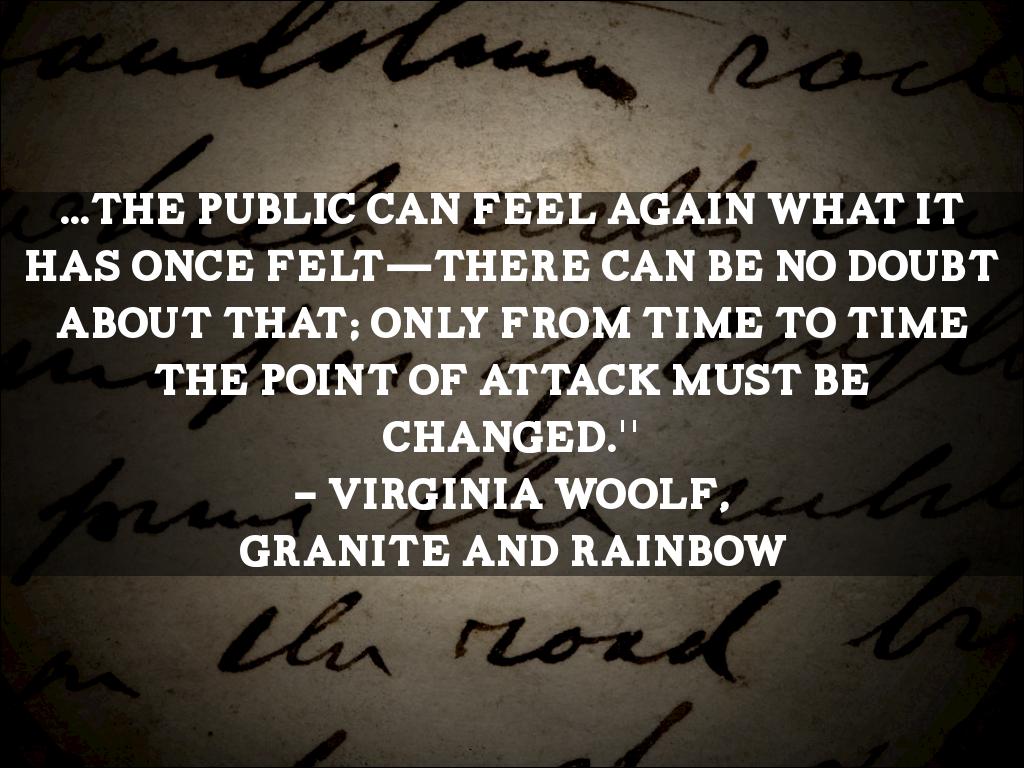 ...The public can feel again what it has once felt—there can be no doubt about that; only from time to time the point of attack must be changed.'' - Virginia Woolf, Granite and Rainbow