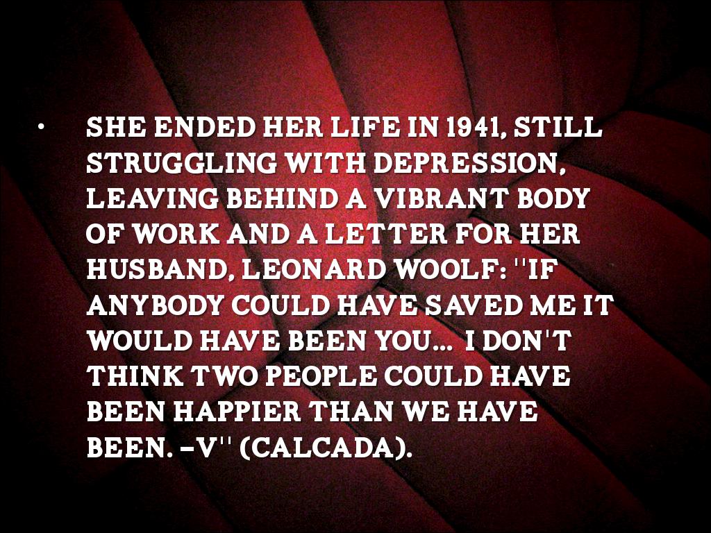 She ended her life in 1941, still struggling with depression, leaving behind a vibrant body of work and a letter for her husband, leonard woolf: ''If anybody could have saved me it would have been you... I don't think two people could have been happier than we have been. -V'' (calcada).