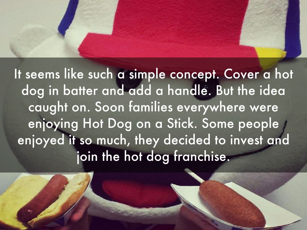 It seems like such a simple concept. Cover a hot dog in batter and add a handle. But the idea caught on. Soon families everywhere were enjoying Hot Dog on a Stick. Some people enjoyed it so much, they decided to invest and join the hot dog franchise.