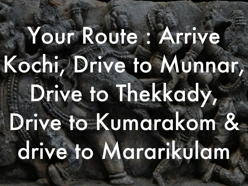 Your Route : Arrive Kochi, Drive to Munnar, Drive to Thekkady, Drive to Kumarakom & drive to Mararikulam