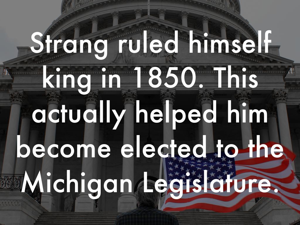 Strang ruled himself king in 1850. This actually helped him become elected to the Michigan Legislature.