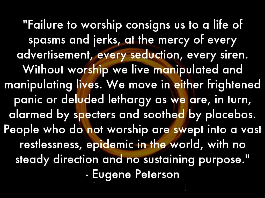 "Failure to worship consigns us to a life of spasms and jerks, at the mercy of every advertisement, every seduction, every siren. Without worship we live manipulated and manipulating lives. We move in either frightened panic or deluded lethargy as we are, in turn, alarmed by specters and soothed by placebos. People who do not worship are swept into a vast restlessness, epidemic in the world, with no steady direction and no sustaining purpose."
