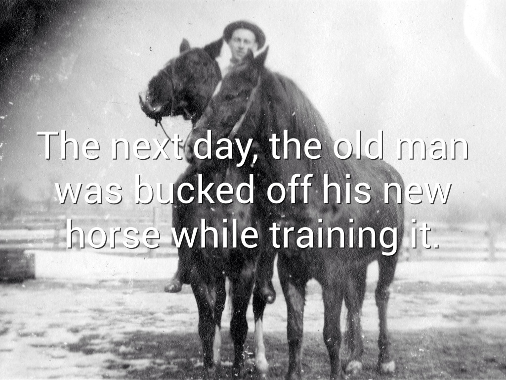 The next day, the old man was bucked off his new horse while training it.