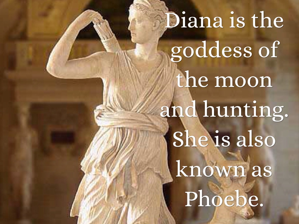 Diana is the goddess of the moon and hunting. She is also known as Phoebe.