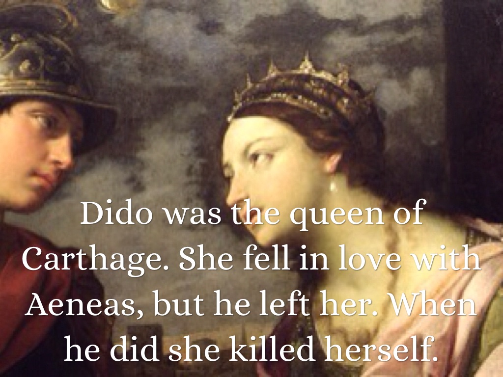 Dido was the queen of Carthage. She fell in love with Aeneas, but he left her. When he did she killed herself.