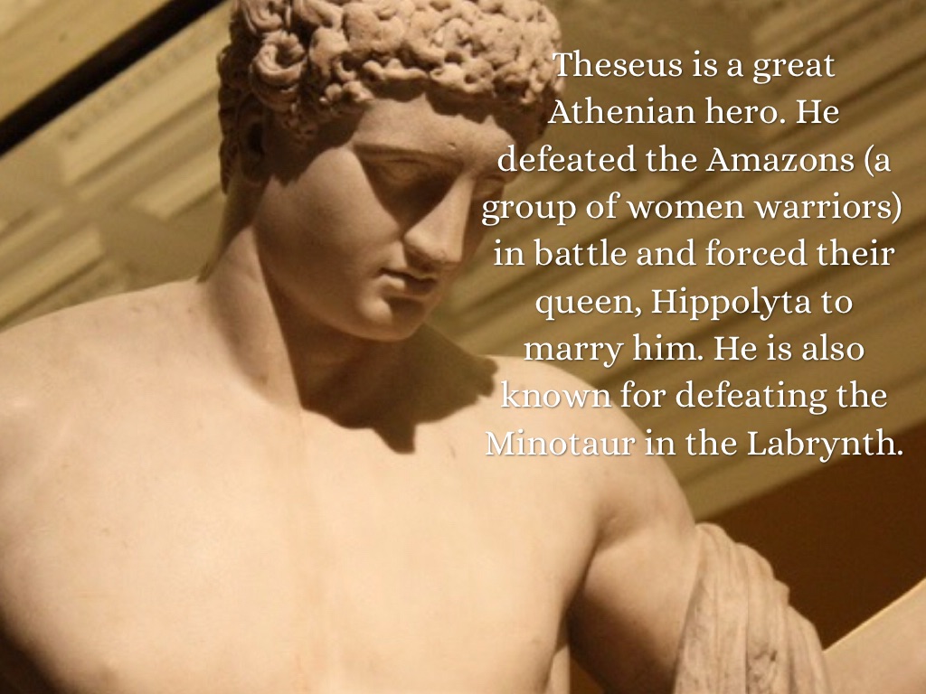Theseus is a great Athenian hero. He defeated the Amazons (a group of women warriors) in battle and forced their queen, Hippolyta to marry him. He is also known for defeating the Minotaur in the Labrynth.