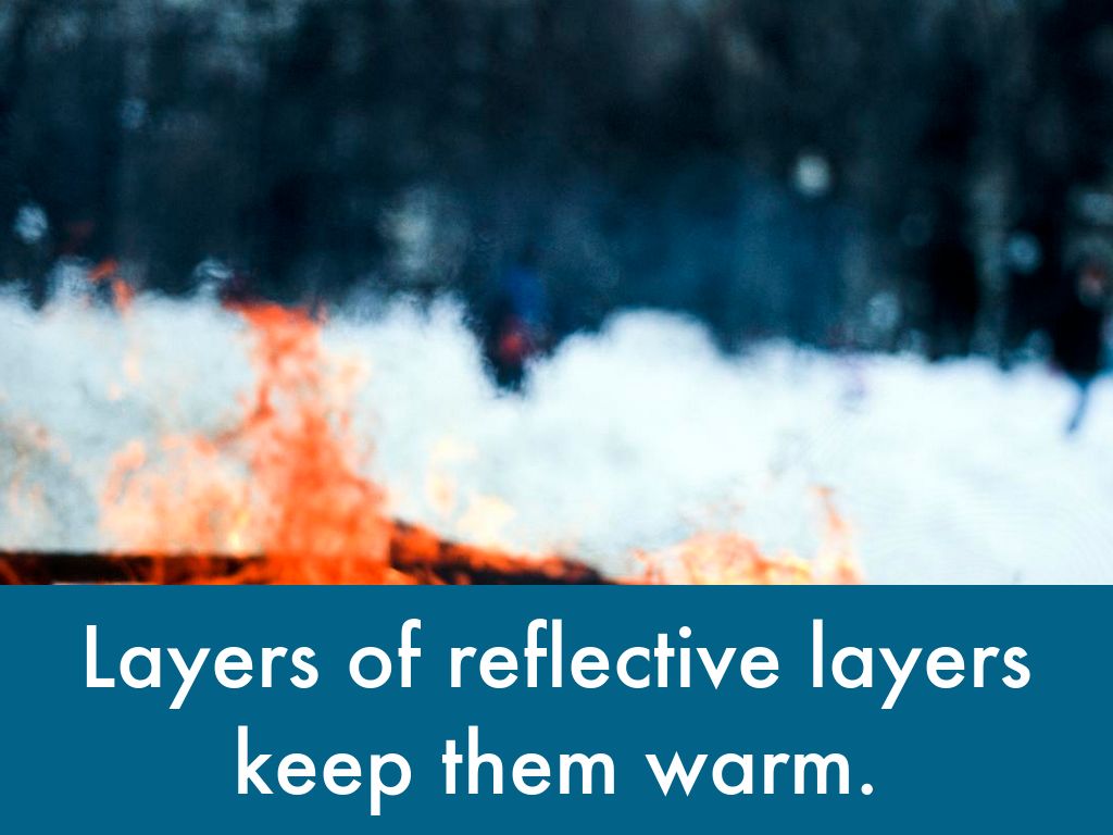 The outer layer is made of a blend of three fabrics. One fabric is waterproof. Another is the material used to make bullet-proof vests. The third fabric is fire-resistant.