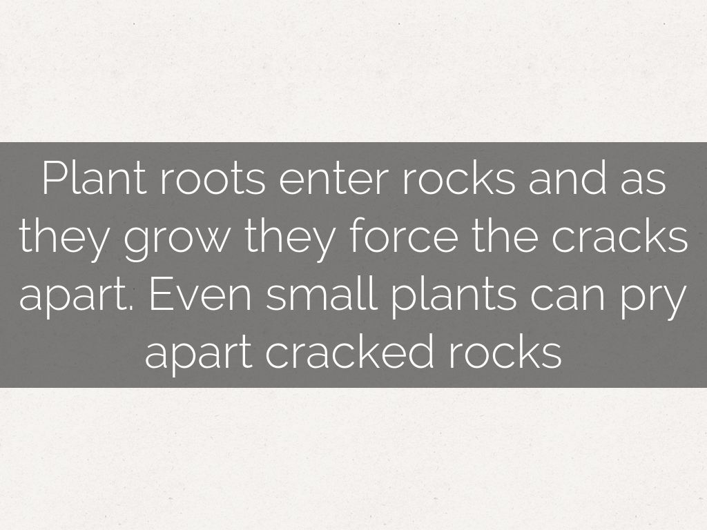 Plant roots enter rocks and as they grow they force the cracks apart. Even small plants can pry apart cracked rocks