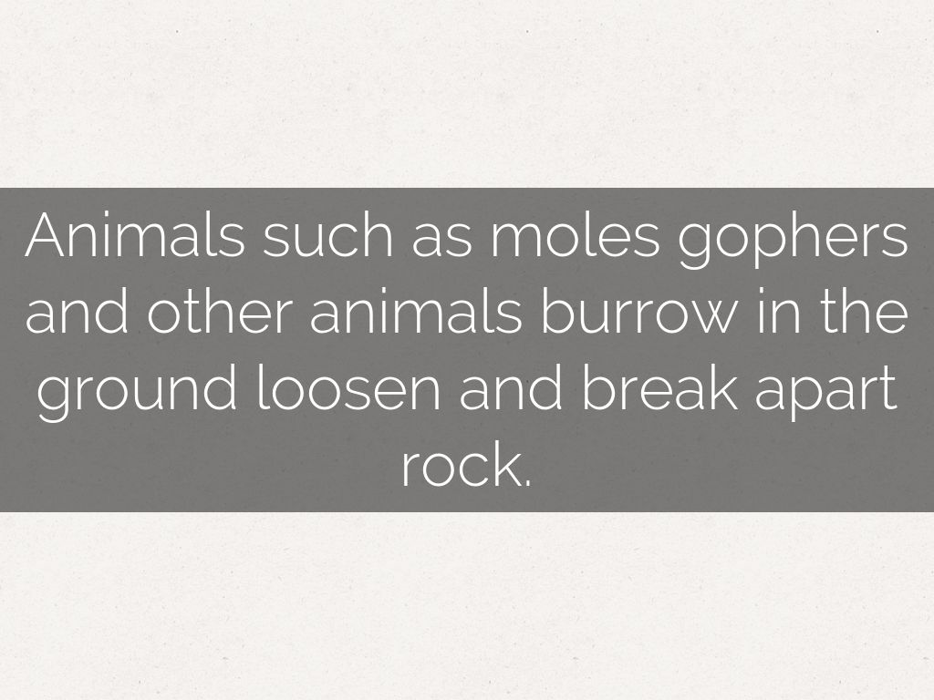 Animals such as moles gophers and other animals burrow in the ground loosen and break apart rock.