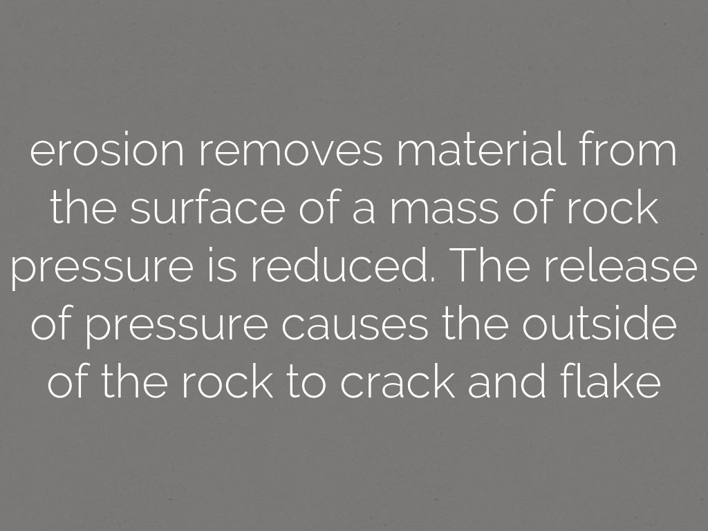 erosion removes material from the surface of a mass of rock pressure is reduced. The release of pressure causes the outside of the rock to crack and flake