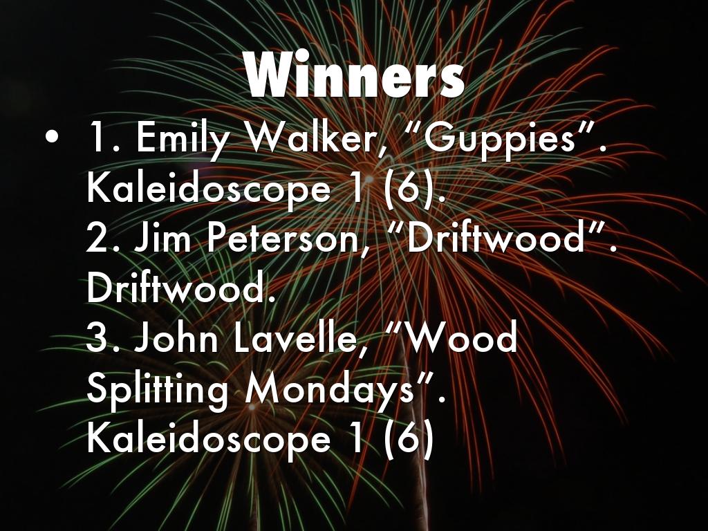 1. Emily Walker, “Guppies”. Kaleidoscope 1 (6). 2. Jim Peterson, “Driftwood”. Driftwood. 3. John Lavelle, “Wood Splitting Mondays”. Kaleidoscope 1 (6)