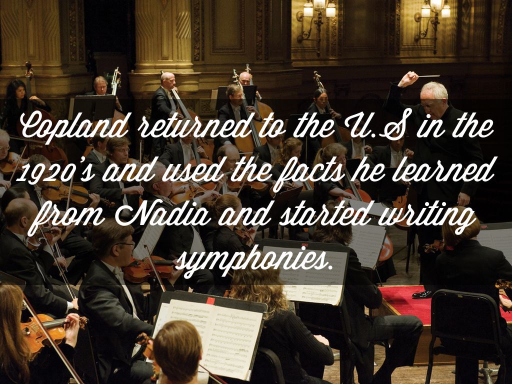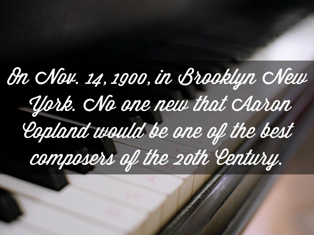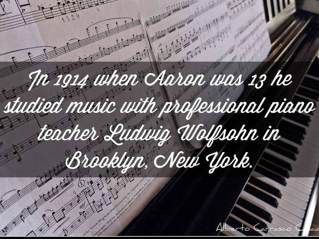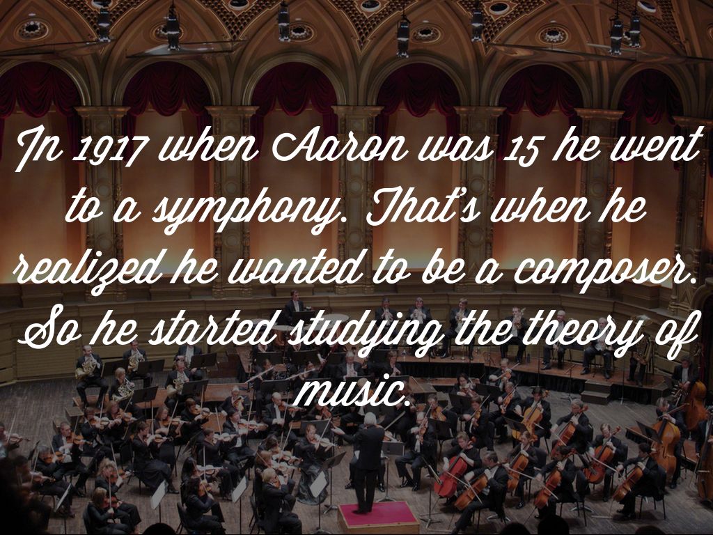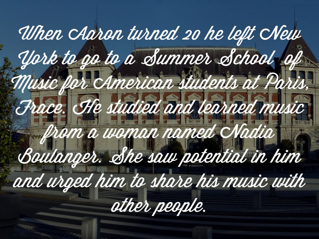 When Aaron turned 20 he left New York to go to a Summer School of Music for American students at Paris, Frace. He studied and learned music from a woman named Nadia Boulanger. She saw potential in him and urged him to share his music with other people.