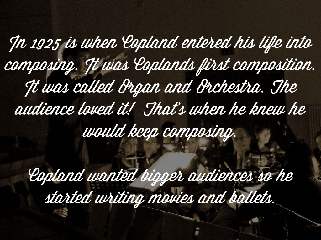 In 1925 is when Copland entered his life into composing. It was Coplands first composition. It was called Organ and Orchestra. The audience loved it! That's when he knew he would keep composing.