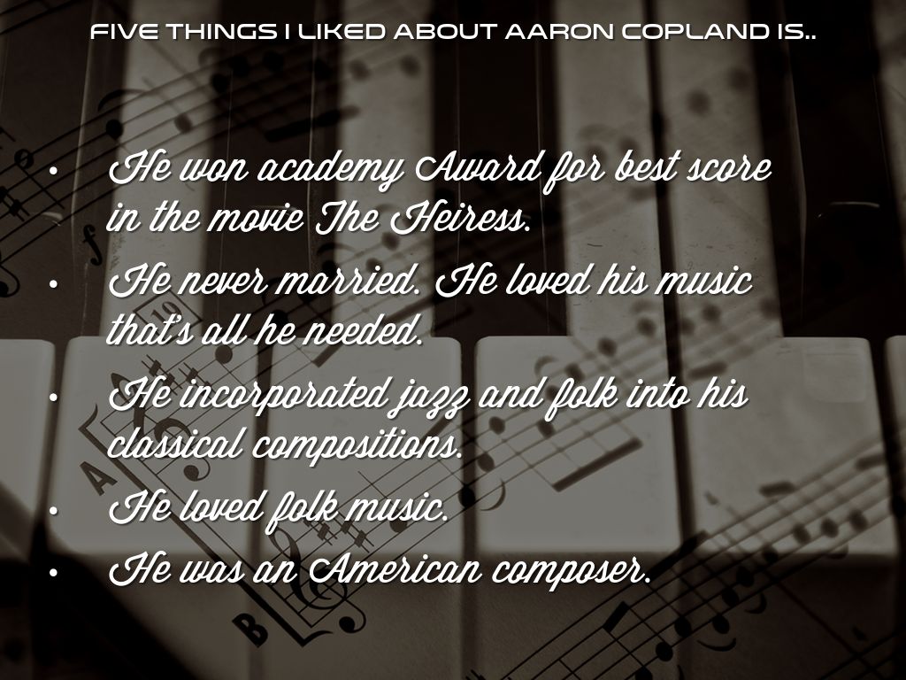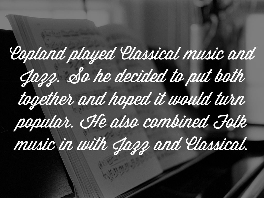 Copland played Classical music and Jazz. So he decided to put both together and hoped it would turn popular. He also combined Folk music in with Jazz and Classical.