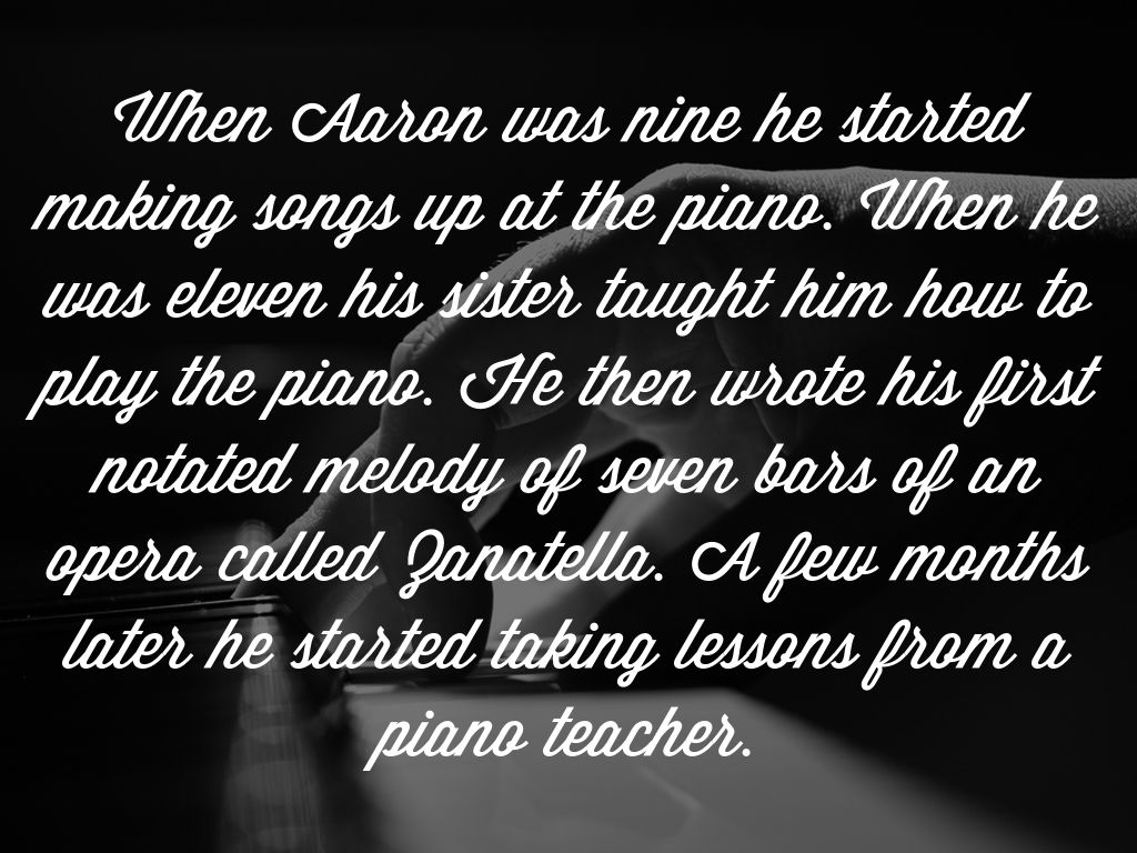 When Aaron was nine he started making songs up at the piano. When he was eleven his sister taught him how to play the piano. He then wrote his first notated melody of seven bars of an opera called Zanatella. A few months later he started taking lessons from a piano teacher.