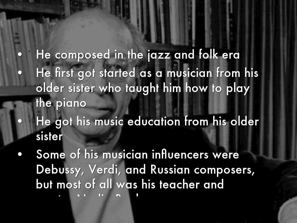 Some of his musician influencers were Debussy, Verdi, and Russian composers, but most of all was his teacher and mentor Nadia Boulanger