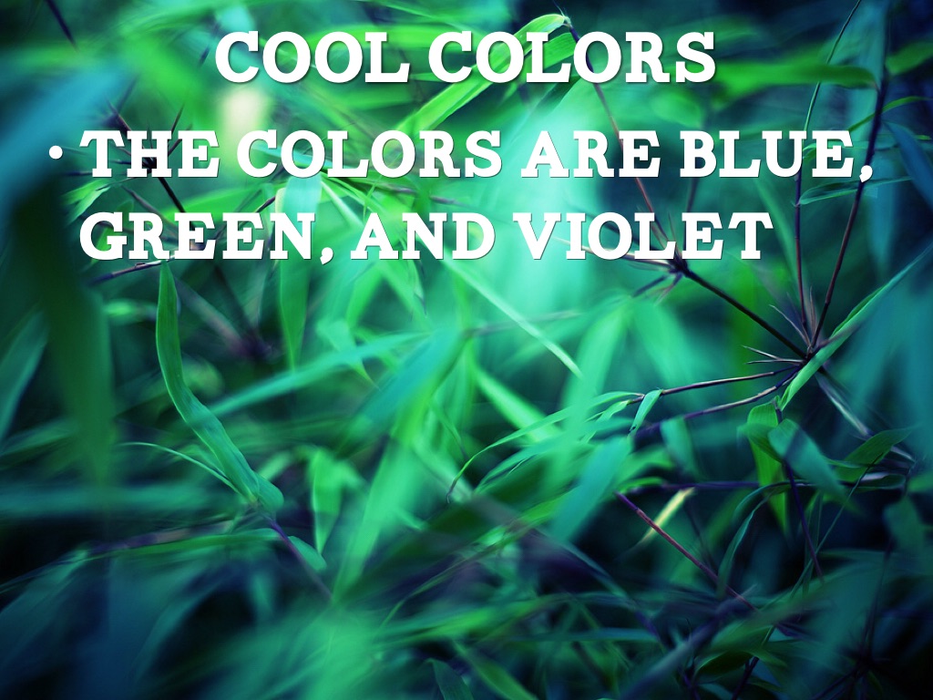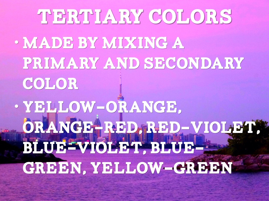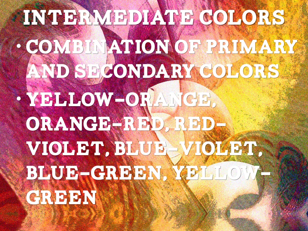 Yellow-orange, orange-red, red-violet, blue-violet, blue-green, yellow-green