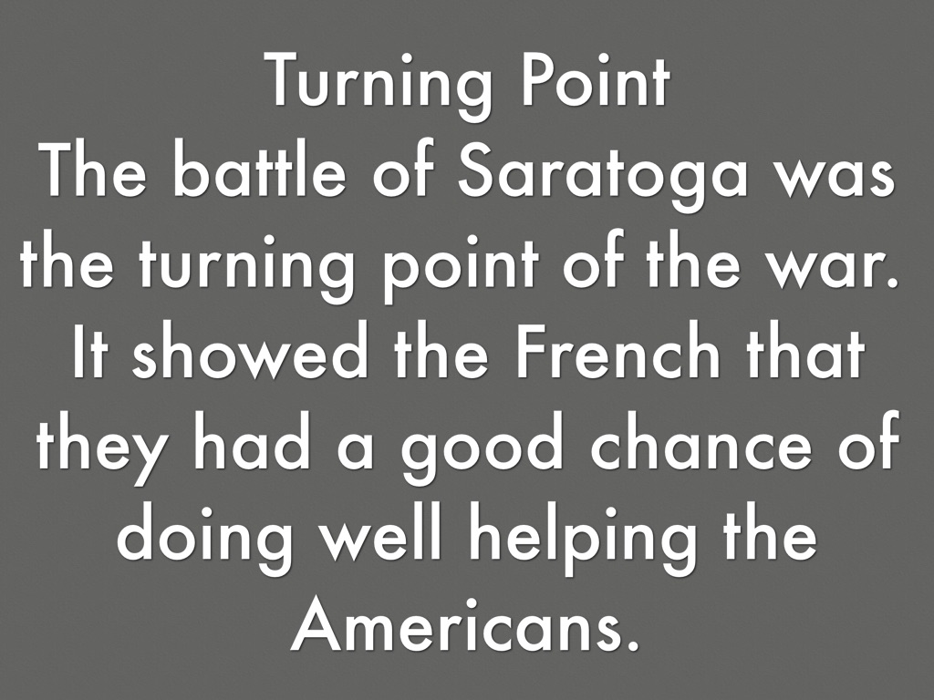 The battle of Saratoga was the turning point of the war. It showed the French that they had a good chance of doing well helping the Americans.