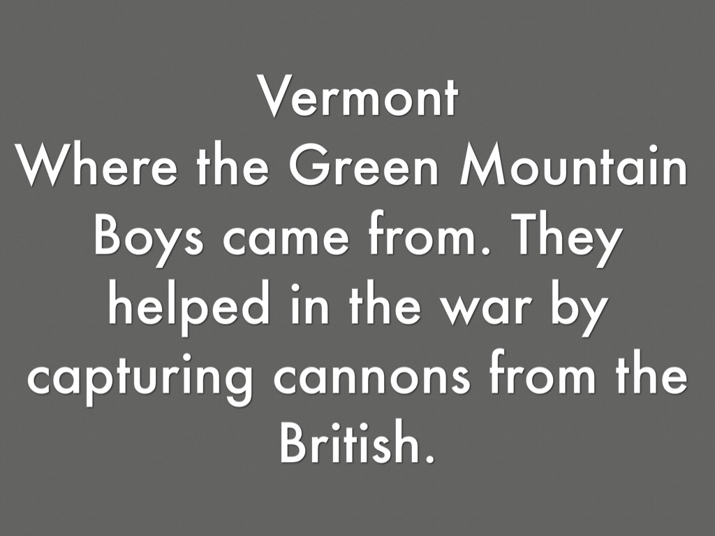 Where the Green Mountain Boys came from. They helped in the war by capturing cannons from the British.