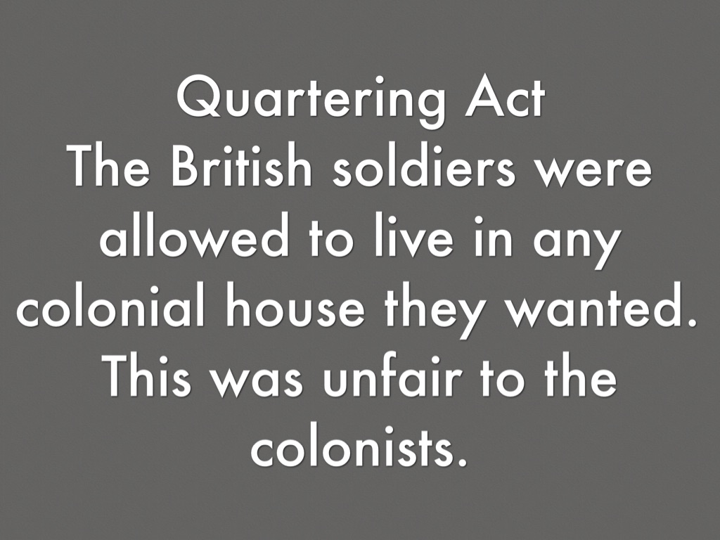 The British soldiers were allowed to live in any colonial house they wanted. This was unfair to the colonists.