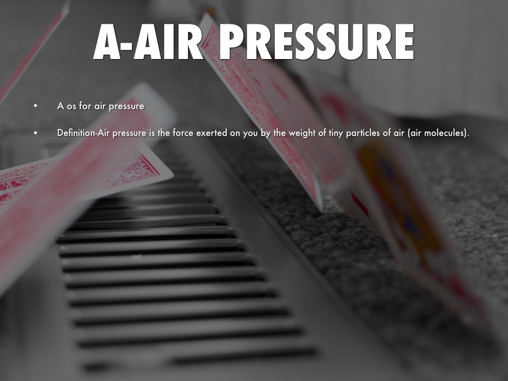 Definition-Air pressure is the force exerted on you by the weight of tiny particles of air (air molecules).