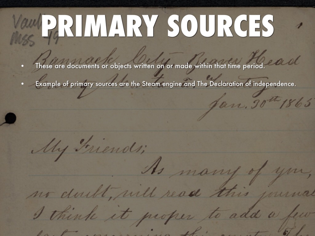Example of primary sources are the Steam engine and The Declaration of independence.