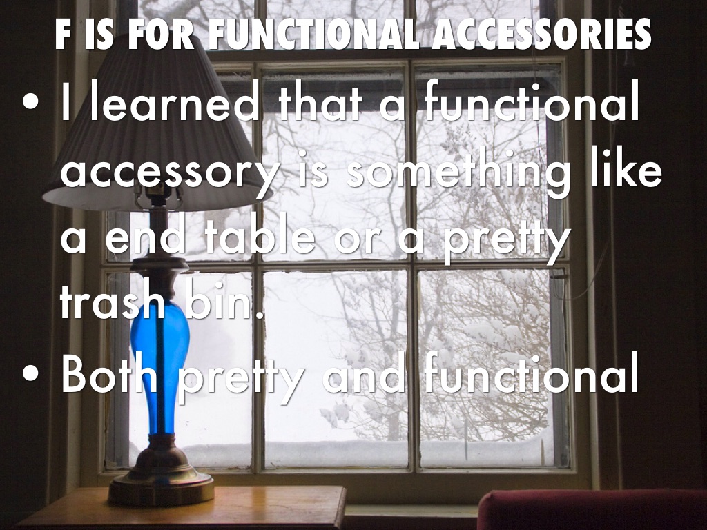 I learned that a functional accessory is something like a end table or a pretty trash bin.