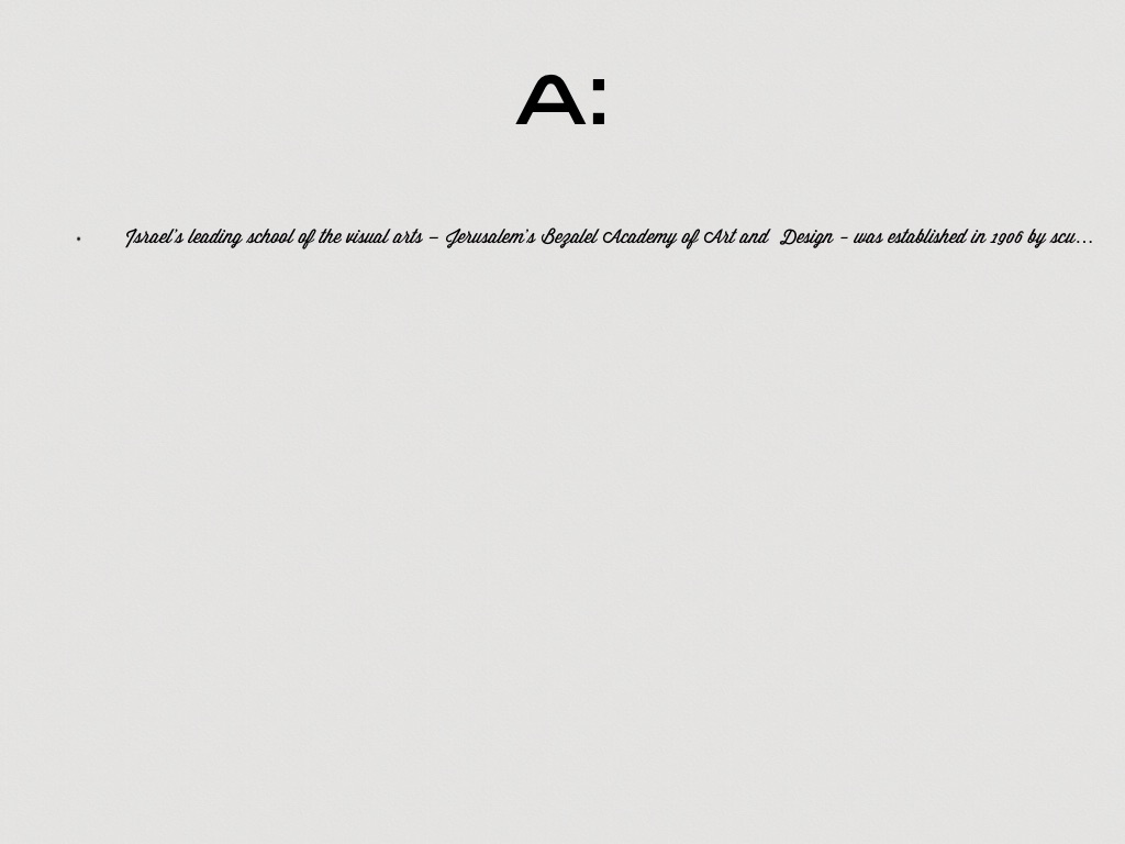 Israel's leading school of the visual arts – Jerusalem’s Bezalel Academy of Art and Design - was established in 1906 by sculptor Boris Schatz. Named for Bezalel Ben Uri - the first artist mentioned in the Bible - its establishment is considered the first major milestone in the development of art in modern Israel.