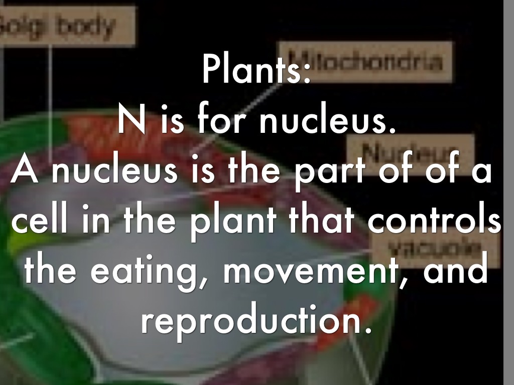 A nucleus is the part of of a cell in the plant that controls the eating, movement, and reproduction.