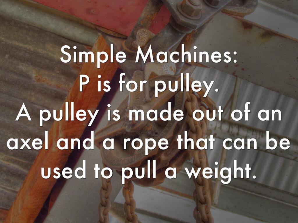 A pulley is made out of an axel and a rope that can be used to pull a weight.