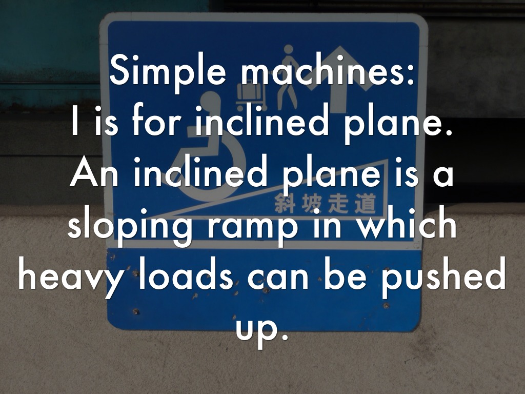 An inclined plane is a sloping ramp in which heavy loads can be pushed up.