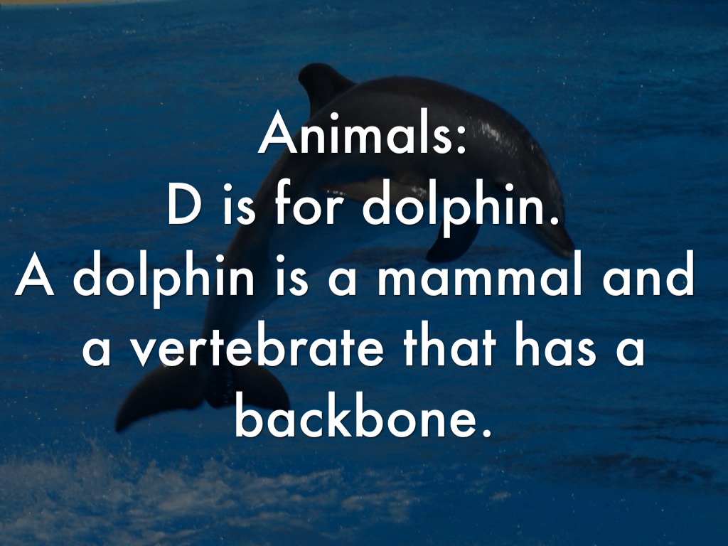 A dolphin is a mammal and a vertebrate that has a backbone.