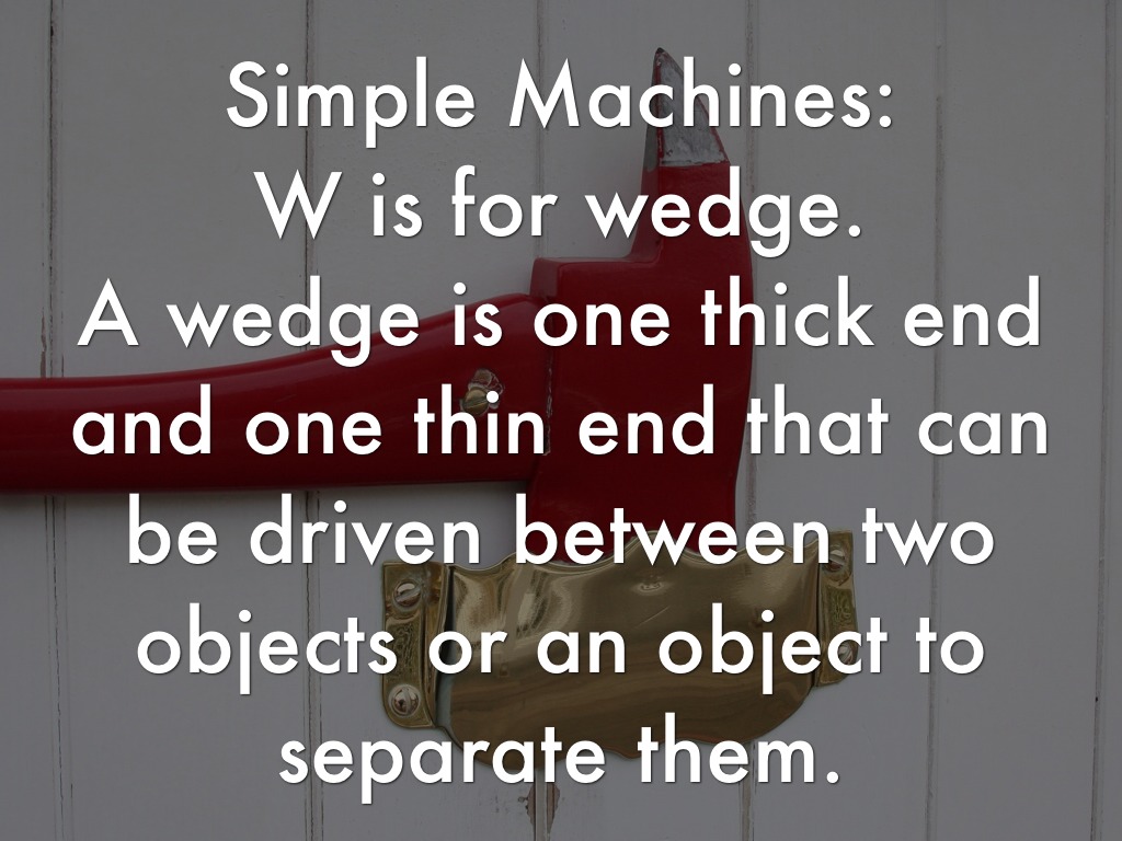A wedge is one thick end and one thin end that can be driven between two objects or an object to separate them.