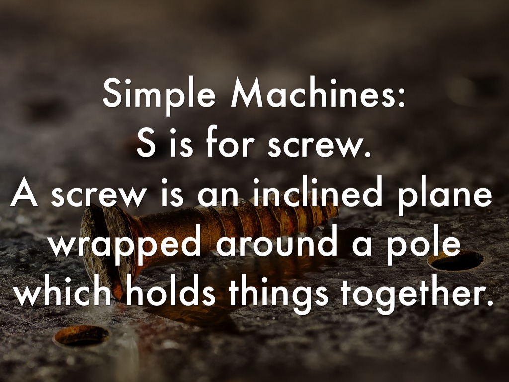 A screw is an inclined plane wrapped around a pole which holds things together.