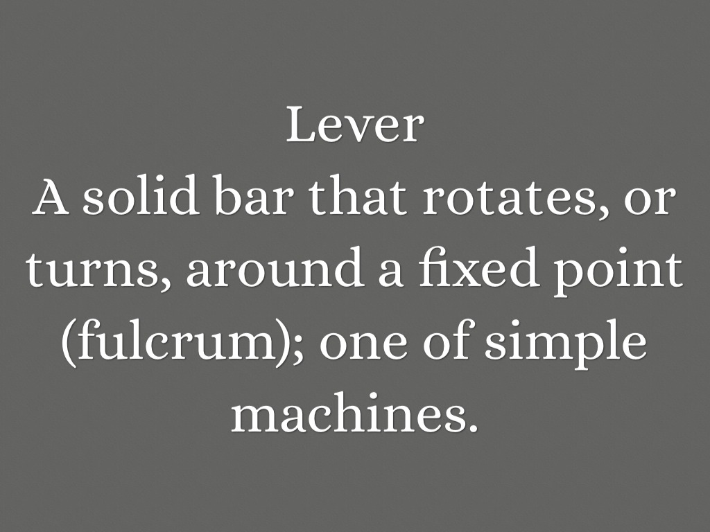 A solid bar that rotates, or turns, around a fixed point (fulcrum); one of simple machines.